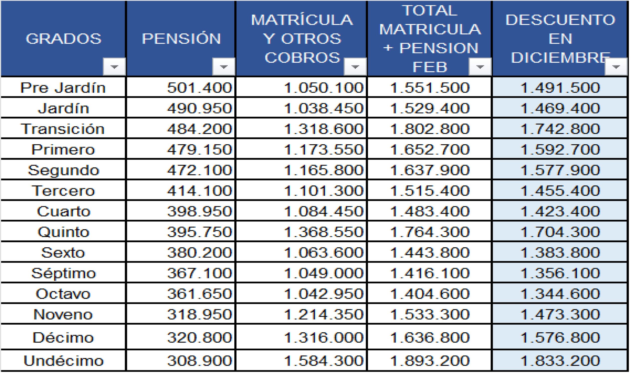 COSTOS PARA MATRÍCULAS DEL AÑO 2026